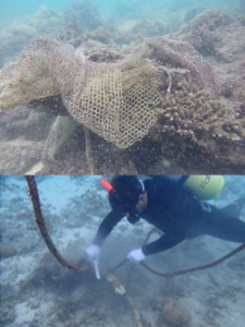 高潮や台風などの影響により、石垣島周辺の多くの場所でゴーストギア(廃棄や紛失により海に流された漁具)が珊瑚を覆い、絡みついたまま成長しています。これは、珊瑚の生育に悪影響を及ぼすのはもとより、ダイバーの体や機材に絡まって事故の元となることもあり、大変危険です。