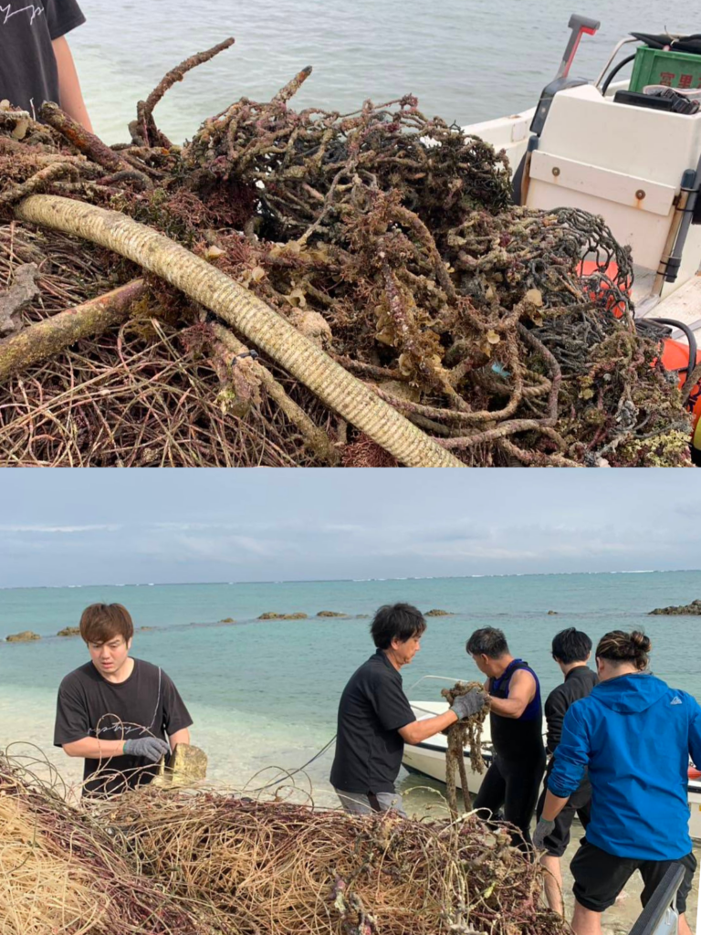 2024年度は白保付近を重点的に、島のおよそ東半分のゴーストギアを軽トラック4台分撤去、2025年~2026年にかけは西半分について行います。(海人協力:白保、新里さん。崎枝、名嘉さん。有限会社海遊さん)