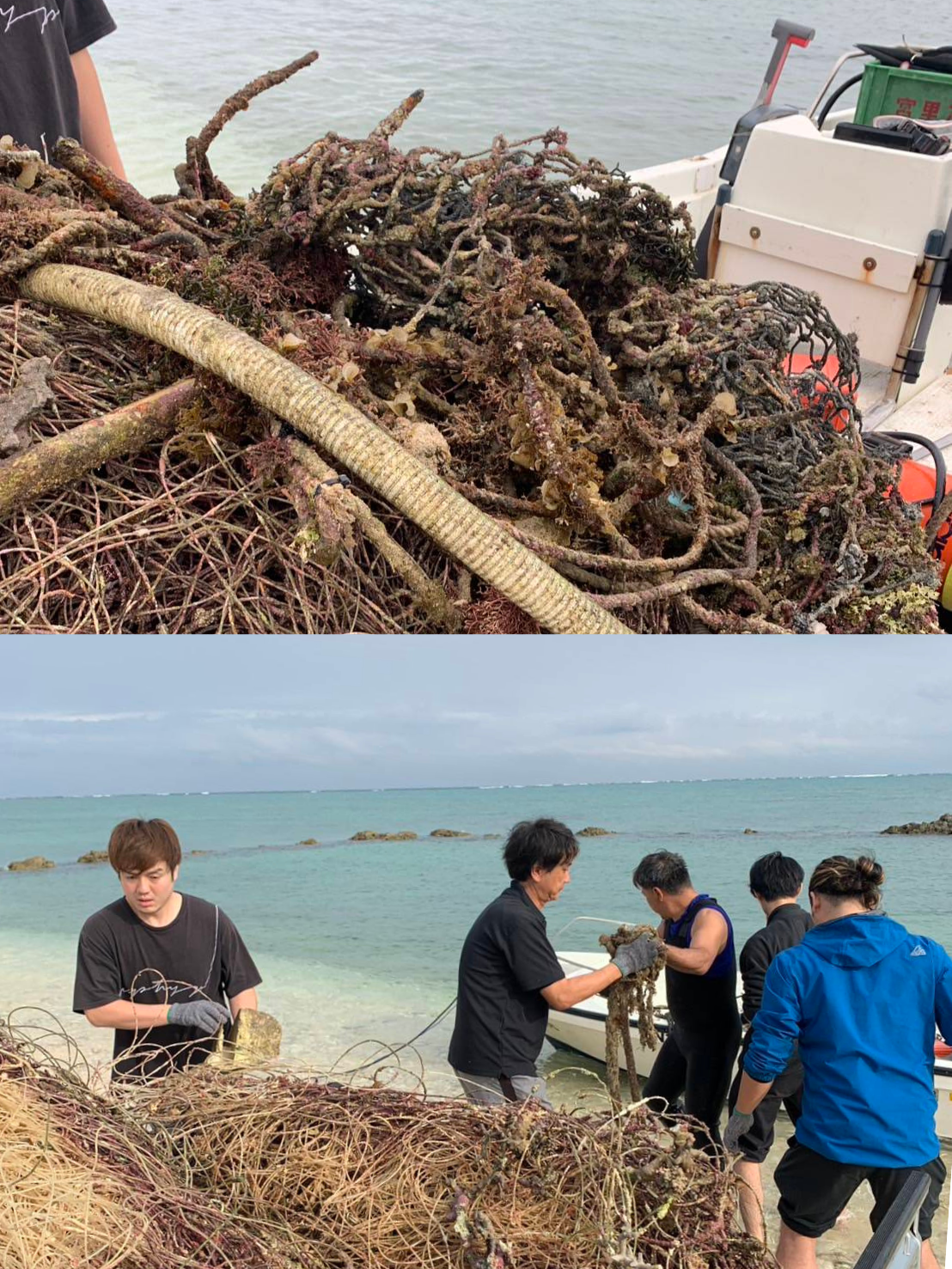 2024年度は白保付近を重点的に、島のおよそ東半分のゴーストギアを軽トラック4台分撤去、2025年~2026年にかけは西半分について行います。(海人協力:白保、新里さん。崎枝、名嘉さん。有限会社海遊さん)